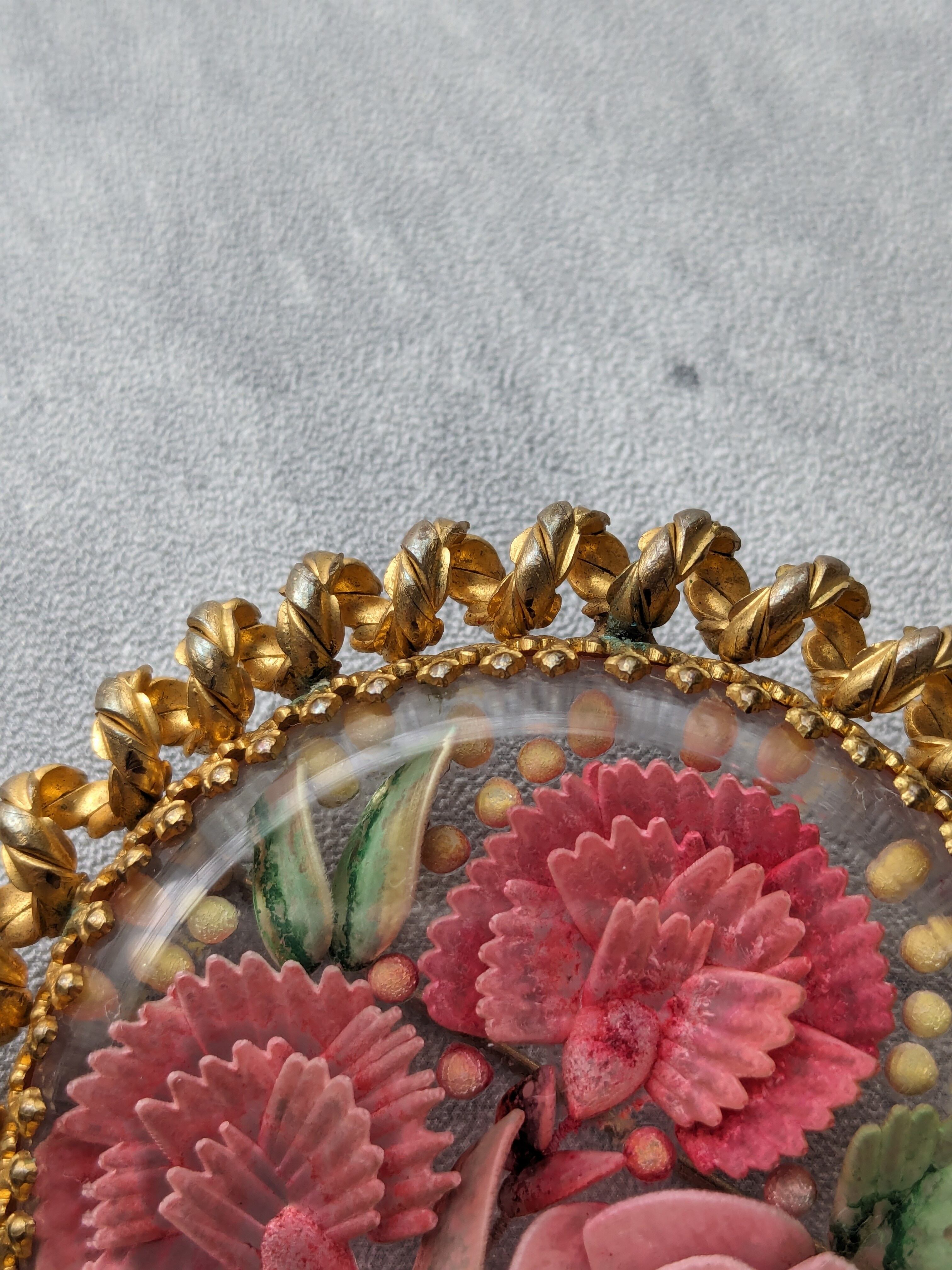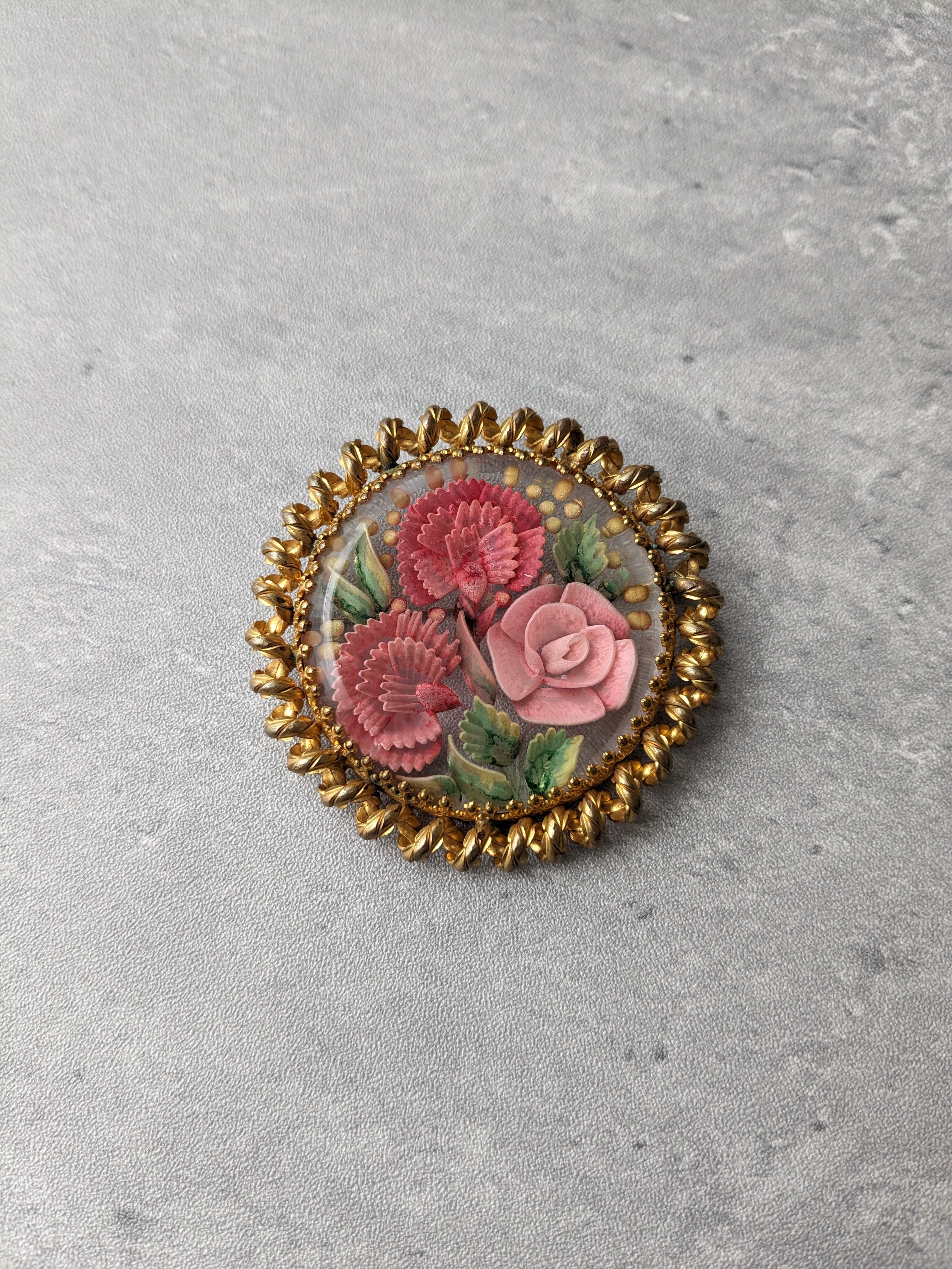 バラとカーネーションのゴールド枠がゴージャスでお洋服が華やかになります。