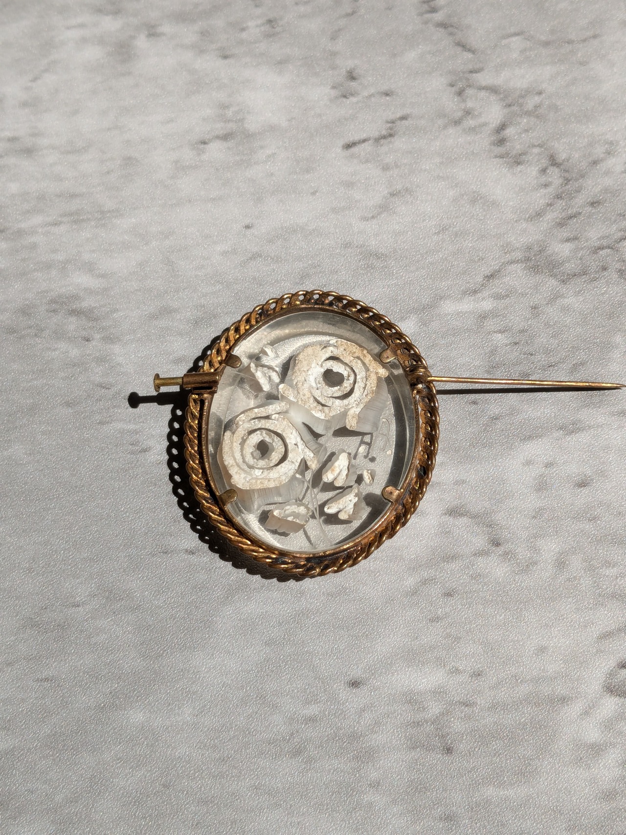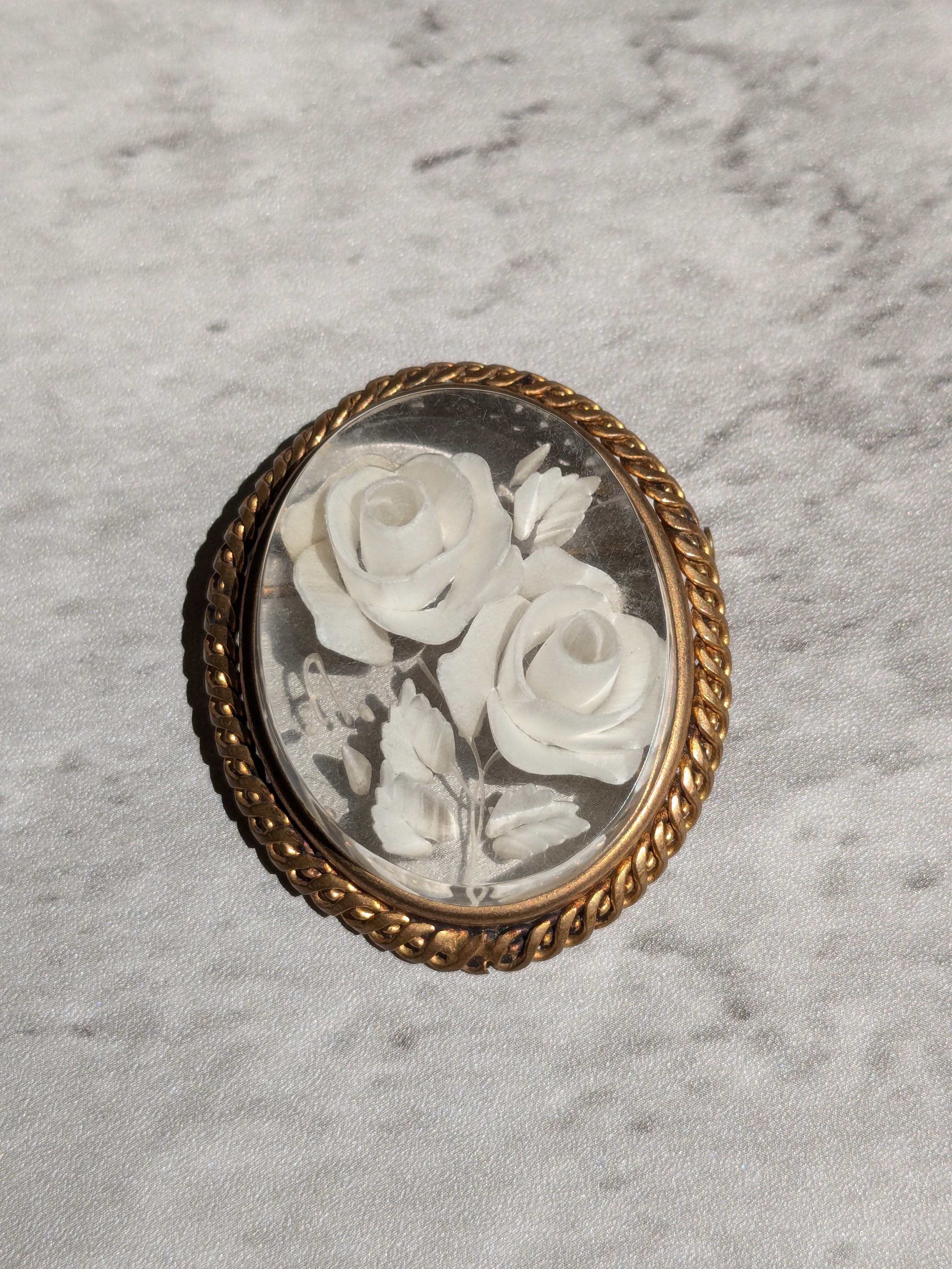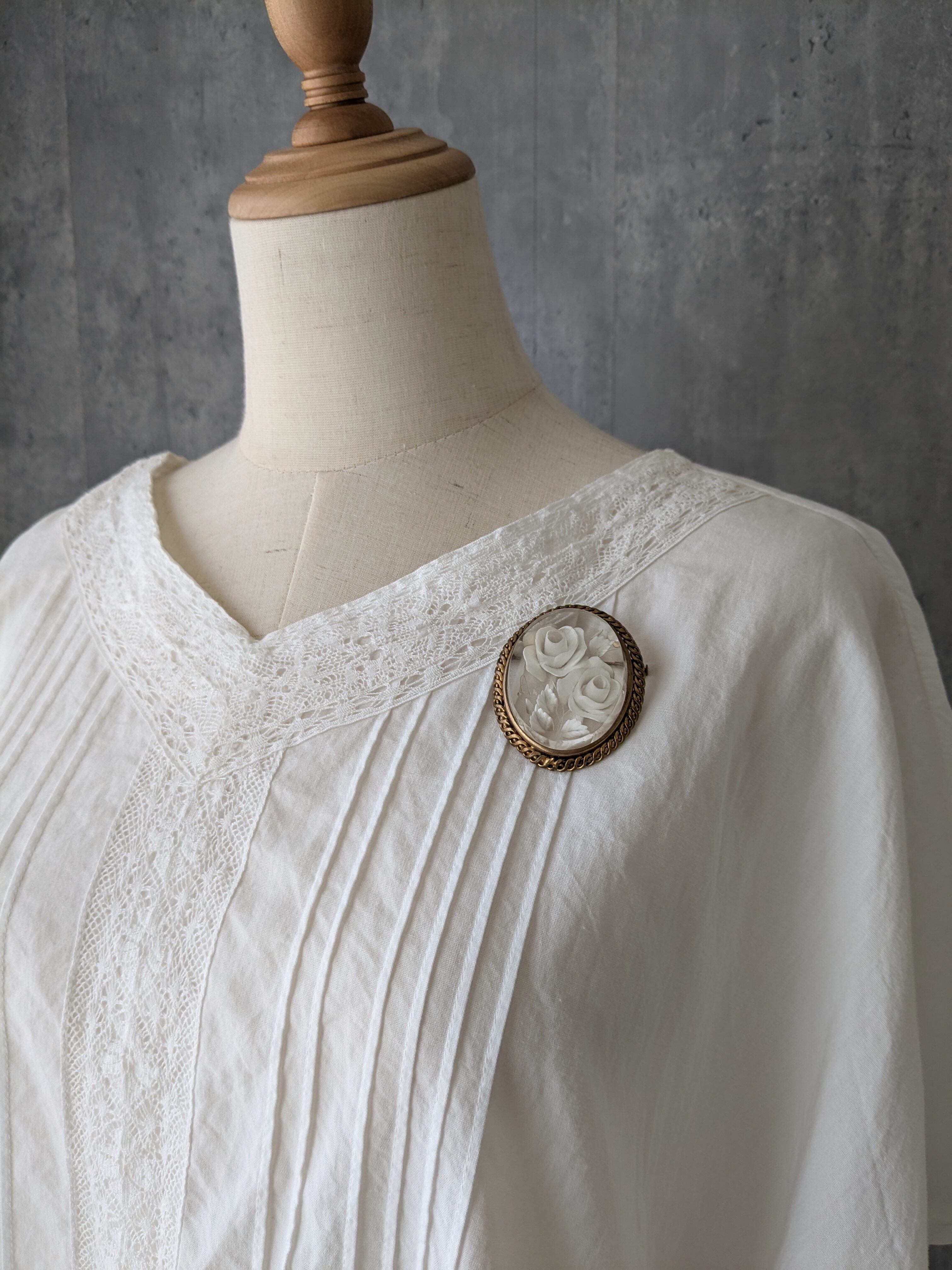 ホワイトのバラの模様とゴールドの枠が華やかなブローチです。